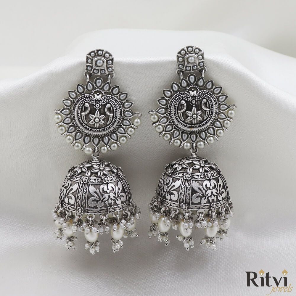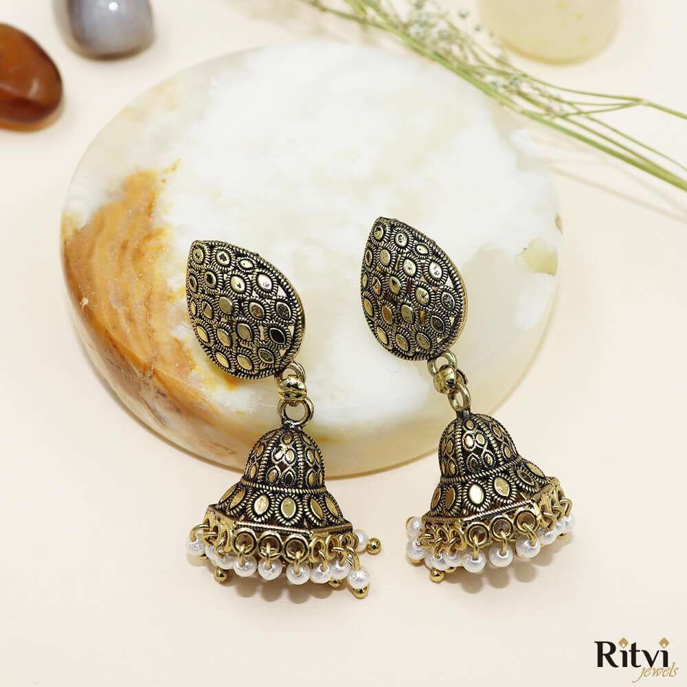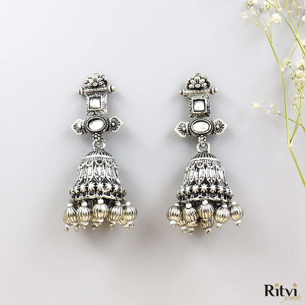 Oxidized Jhumkas: Embrace the timeless beauty of oxidized jhumkas, a must-have for ethnic wear enthusiasts. These classic designs, available at Ritvi Jewels, complement sarees, lehengas, and salwar suits with a graceful flair.