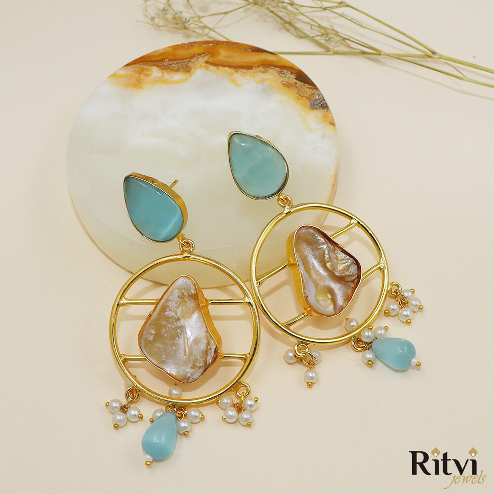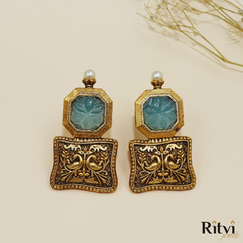 Oxidized Firozi Earrings: Add a splash of vibrance to your look with oxidized firozi earrings, featuring turquoise and aqua accents. These earrings from Ritvi Jewels are perfect for creating a bold and bohemian statement.