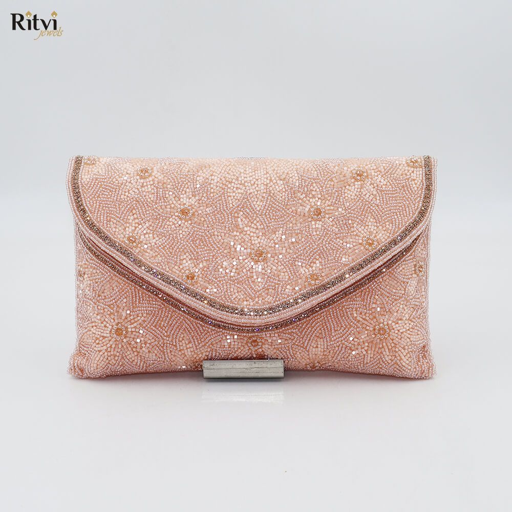 Our handmade handbags at Ritvi Jewels are crafted by expert artisans using high-quality materials, ensuring unique designs, durability, and elegance. Available in golden, white, black, and coral pink, these bags are perfect for any occasion.