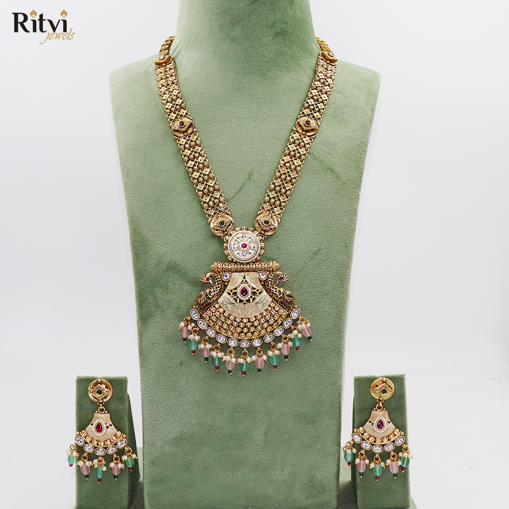 Ritvi Vanshita Mint Meena Gold Long Necklace Set