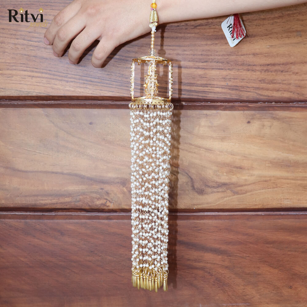 These traditional hanging ornaments also called Kaleera are worn by brides in India and are usually crafted as umbrella-shaped structures with intricate details, including beads, tassels, pearls, shells, butterflies, hearts and sometimes even ghungroos (small bells). The intricate designs, materials, and rituals associated with Kalira reflect the cultural heritage of the region. It’s believed that if a piece of the Kalira falls on someone, they’ll be the next to get married. This tradition adds an element of excitement and anticipation to the wedding celebrations. Bridal Kaleera are not just accessories but are deeply rooted in tradition and cultural symbolism, representing prosperity, happiness, and the bond of marriage. They encapsulate the blessings, hopes, and well-wishes for the bride’s journey into married life.