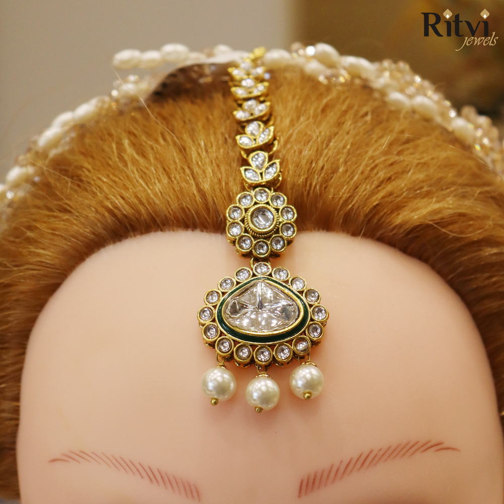 Barkha Kundan Maang Tikka is a traditional Indian hair ornament worn on the forehead, usually part of bridal or festive jewellery. It features intricate craftsmanship using the ancient art of Kundan jewellery, where gemstones are set in gold or silver foil.