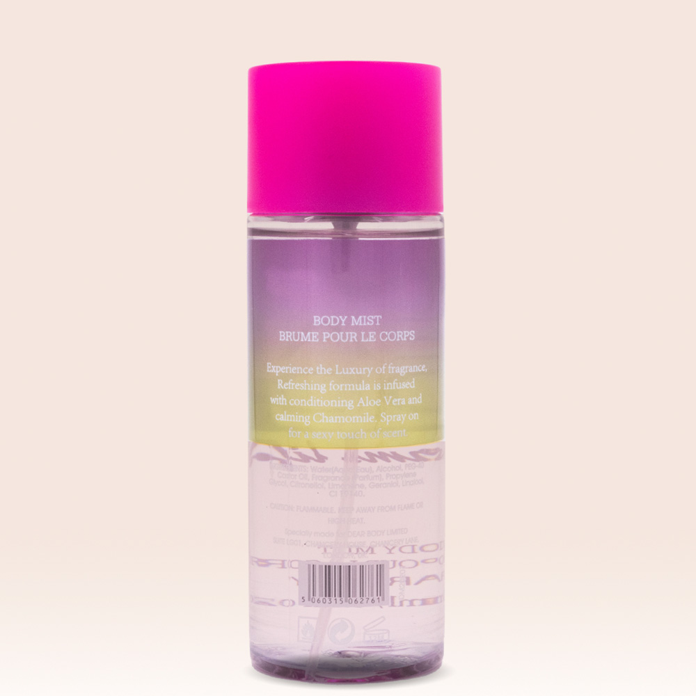 The fragrance opens with a vibrant burst of red berries, bergamot, and pear, creating a lively and refreshing start. The heart reveals a delicate floral bouquet of jasmine, peony, and orange blossom, enhancing the mist’s graceful and feminine appeal. Finally, the scent settles into a warm and sensual base of vanilla, amber, and musk, leaving a lasting and irresistible impression.