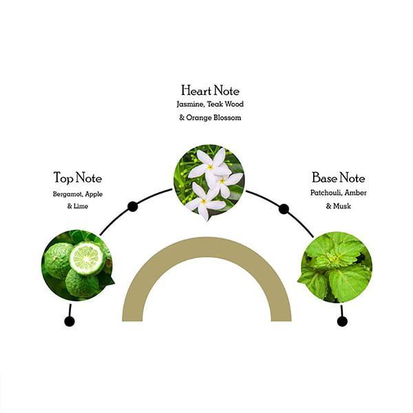 The fragrance opens with a lively burst of crisp apple, refreshing lime, and bergamot, creating a bright and invigorating introduction. The heart reveals a sophisticated blend of orange blossom and the rich warmth of teak wood, adding depth and complexity. It settles into a smooth base of patchouli, sweet vanilla, and musk, leaving a long-lasting and captivating finish.