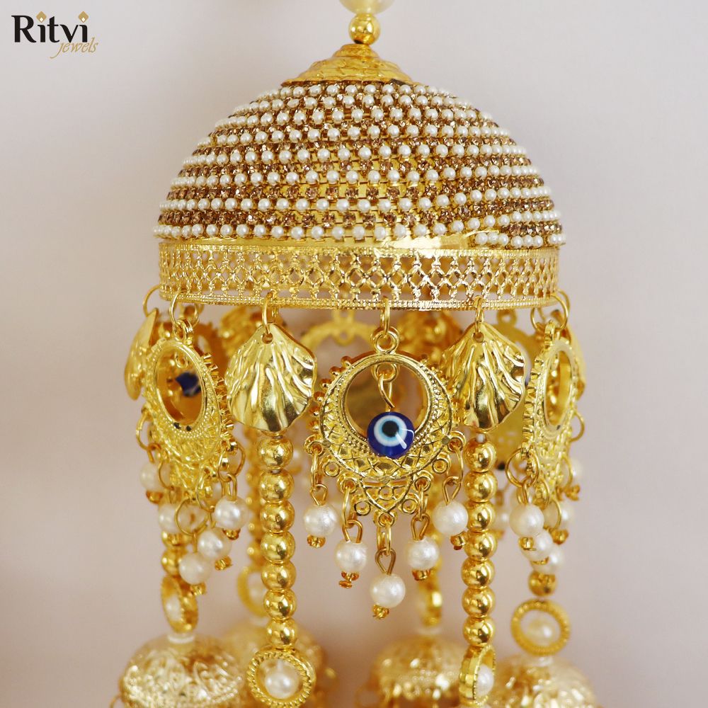 These traditional hanging ornaments also called Kaleera are worn by brides in India and are usually crafted as umbrella-shaped structures with intricate details, including beads, tassels, pearls, shells, butterflies, hearts and sometimes even ghungroos (small bells). The intricate designs, materials, and rituals of Kalira reflect the region’s cultural heritage. It’s believed that if a piece of the Kalira falls on someone, they’ll be the next to get married. This tradition adds an element of excitement and anticipation to the wedding celebrations. Bridal Kaleera are not just accessories but are deeply rooted in tradition and cultural symbolism, representing prosperity, happiness, and the bond of marriage. They encapsulate the blessings, hopes, and well-wishes for the bride’s journey into married life.