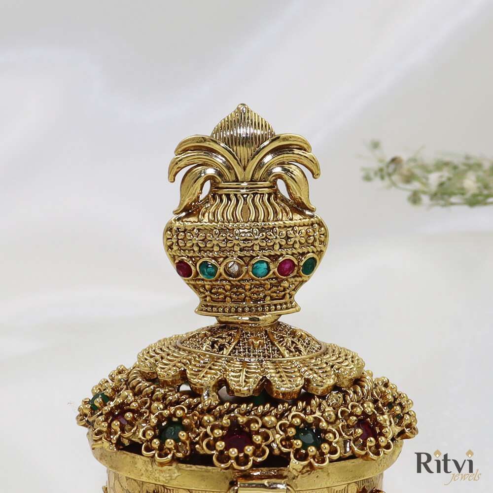 Our Kalash Gold Plated Sindoor Dabbi is the ultimate decorative container to store and apply sindoor by married women. It’s made of precious metal and high gold plating with intricate work. The design of the sindoor box showcases Kalash religious symbol significant to the Indian culture. The box has a lid to secure the sindoor from spilling. It is a symbol of tradition, beauty, and marital bliss.