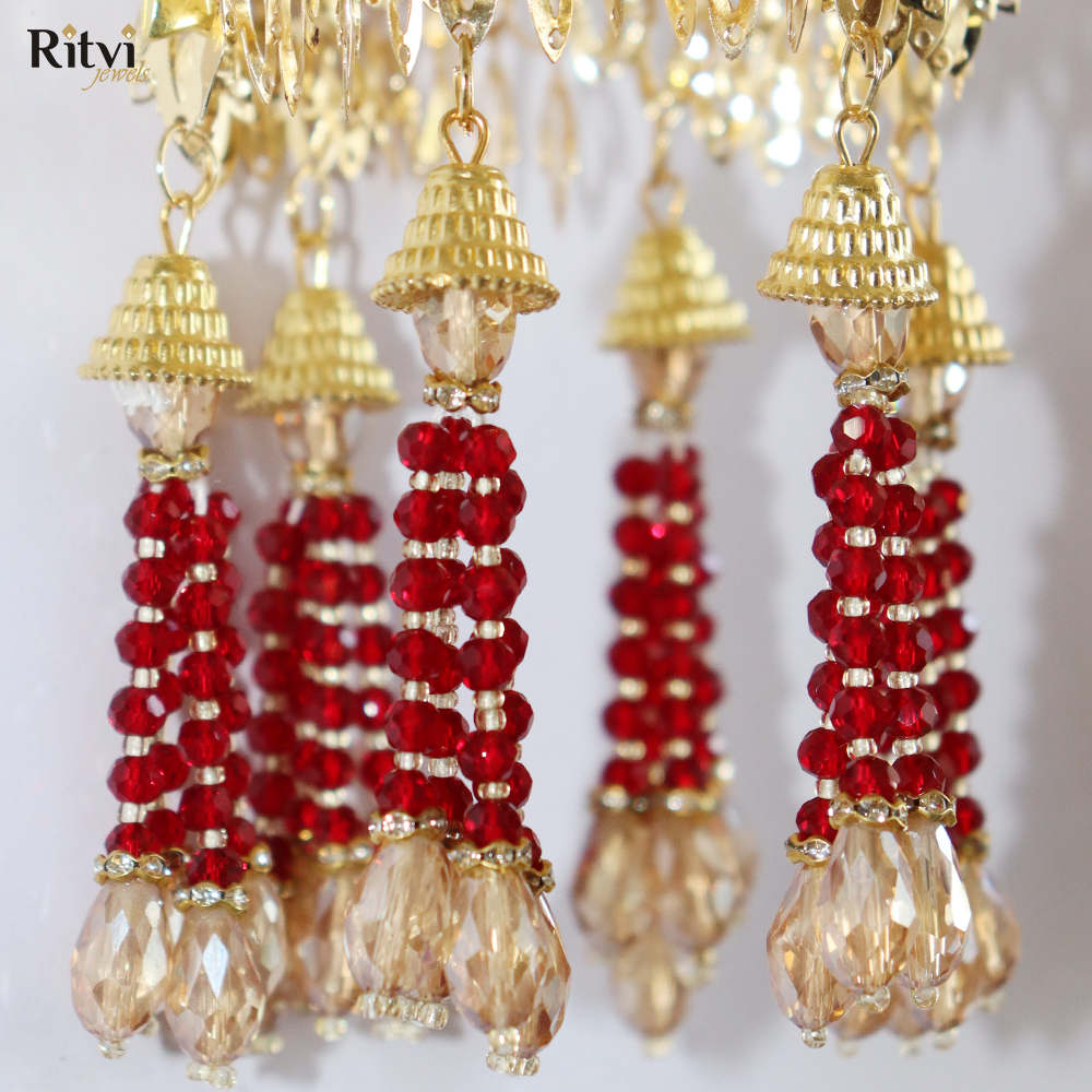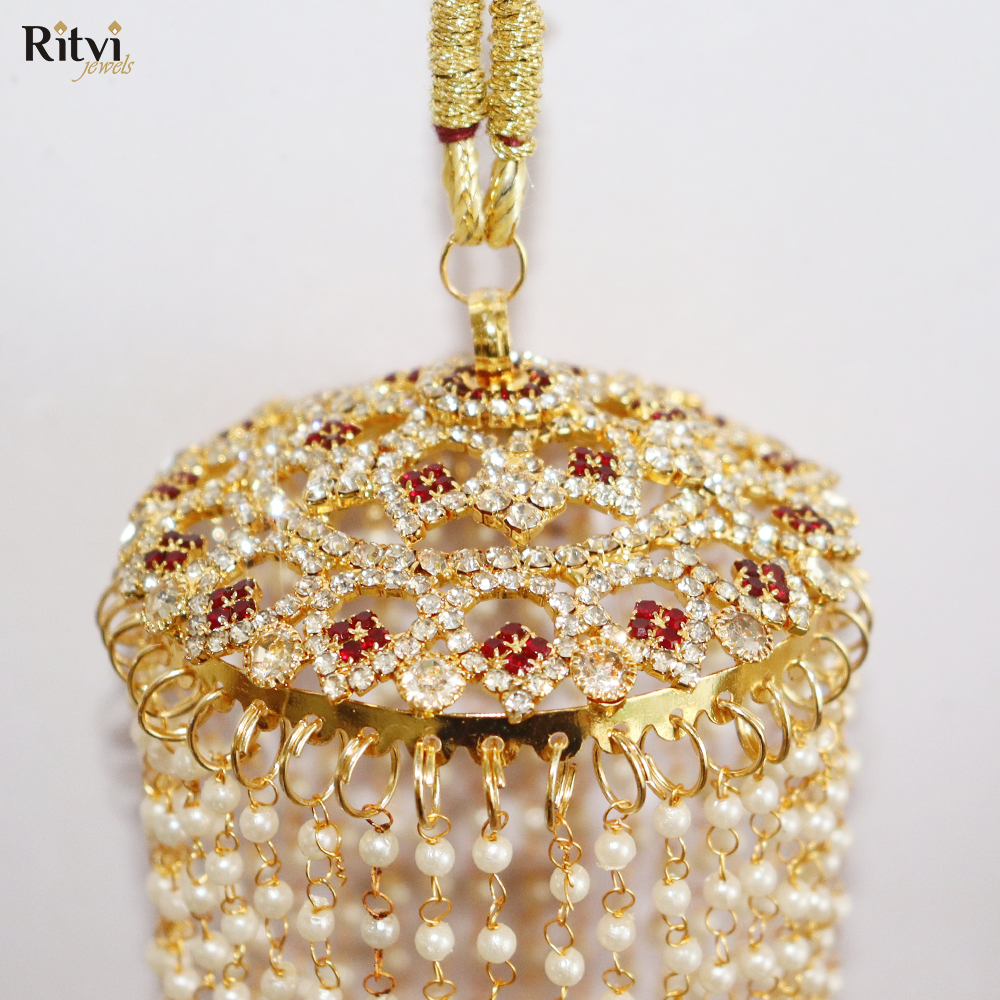 These traditional hanging ornaments also called Kaleera are worn by brides in India and are usually crafted as umbrella-shaped structures with intricate details, including beads, tassels, pearls, shells, butterflies, hearts and sometimes even ghungroos (small bells). The intricate designs, materials, and rituals associated with Kalira reflect the cultural heritage of the region. It’s believed that if a piece of the Kalira falls on someone, they’ll be the next to get married. This tradition adds an element of excitement and anticipation to the wedding celebrations. Bridal Kaleera are not just accessories but are deeply rooted in tradition and cultural symbolism, representing prosperity, happiness, and the bond of marriage. They encapsulate the blessings, hopes, and well-wishes for the bride’s journey into married life.