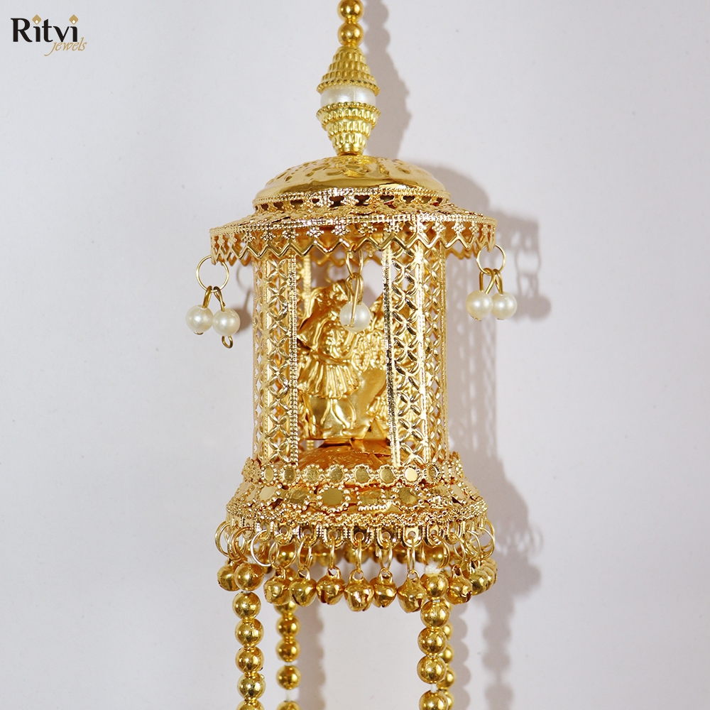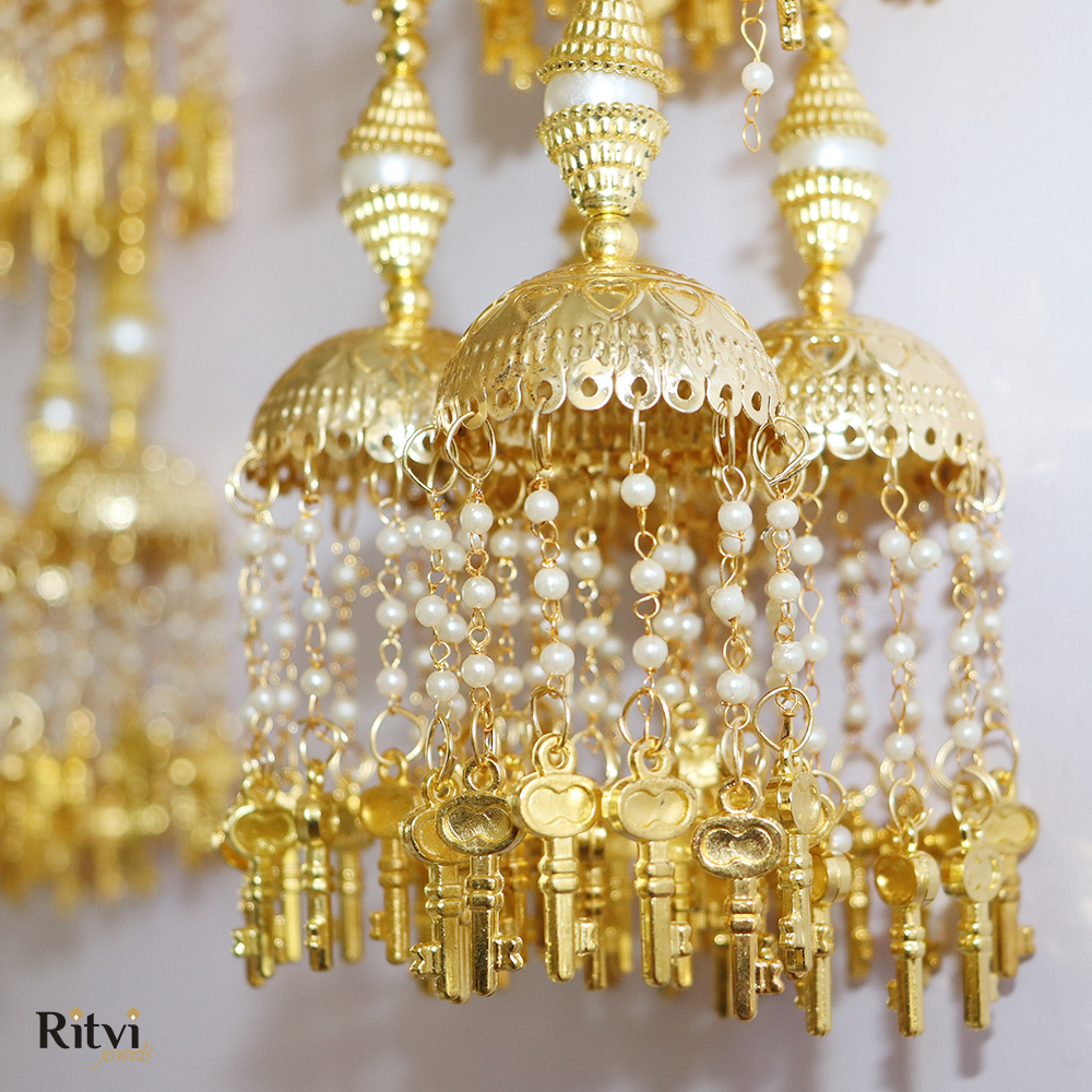 These traditional hanging ornaments also called Kaleera are worn by brides in India and are usually crafted as umbrella-shaped structures with intricate details, including beads, tassels, pearls, shells, butterflies, hearts and sometimes even ghungroos (small bells). The intricate designs, materials, and rituals of Kalira reflect the region’s cultural heritage. It’s believed that if a piece of the Kalira falls on someone, they’ll be the next to get married. This tradition adds an element of excitement and anticipation to the wedding celebrations. Bridal Kaleera are not just accessories but are deeply rooted in tradition and cultural symbolism, representing prosperity, happiness, and the bond of marriage. They encapsulate the blessings, hopes, and well-wishes for the bride’s journey into married life.