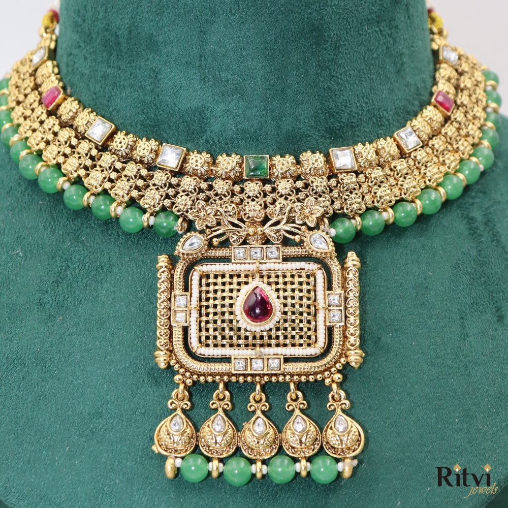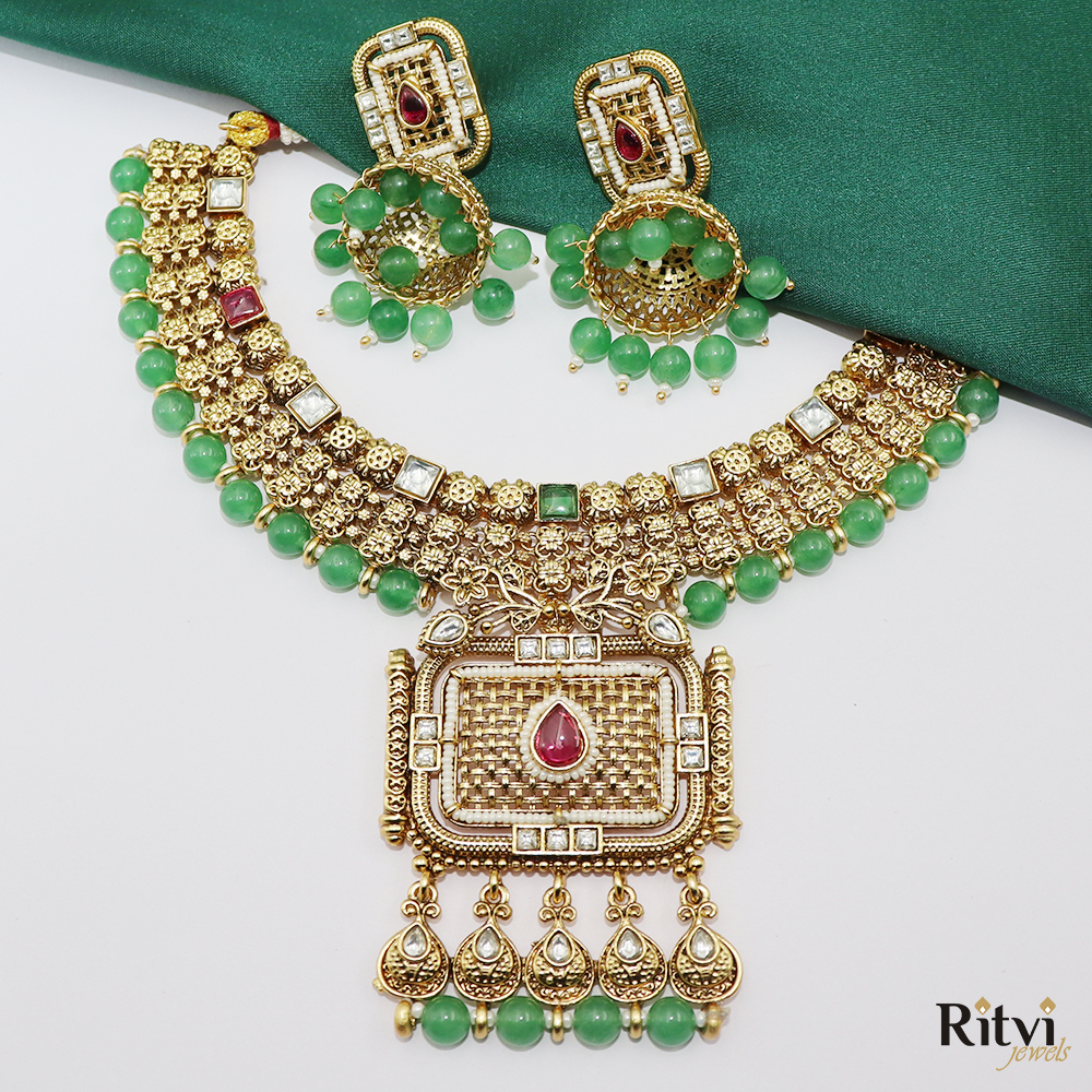Antique necklaces are becoming highly wanted in the modern world because of the look they carry, the craftsmanship and the color stones they use to embellish. And what better way than to have your favourite vintage necklaces at your doorstep by just one click away. Shop our Kriya antique gold necklace set with white pearl and imitation stone detailing.