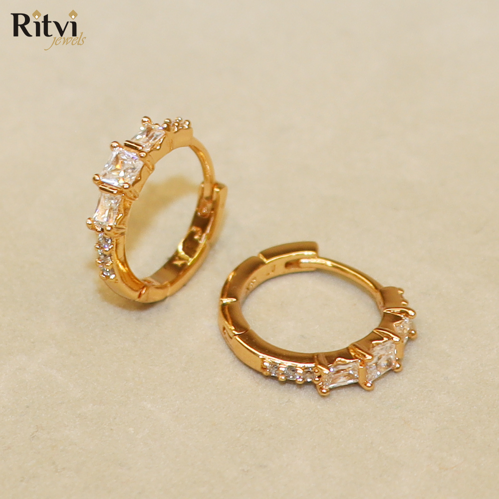 These elegant rose gold earrings feature a trio of princess-cut stones at the center, flanked by smaller sparkling accents. Their refined design adds a graceful sparkle to both casual and formal attire.