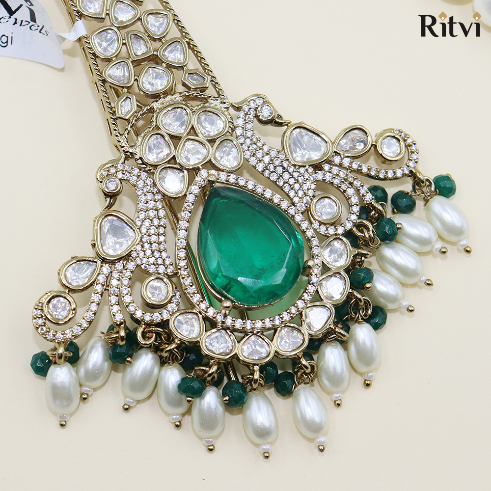 Kalgi is a traditional Indian ornament worn by grooms, as part of their wedding attire. It’s one of the many elements that contribute to the rich and diverse cultural tapestry of Indian weddings. The Kalgi holds cultural and traditional significance, symbolizing the groom’s special and important role during the wedding ceremony. Our Avian Gold Finished Pearl Kundan Kalgi is studded with precious stones and pearls making it an eye-catching accessory.