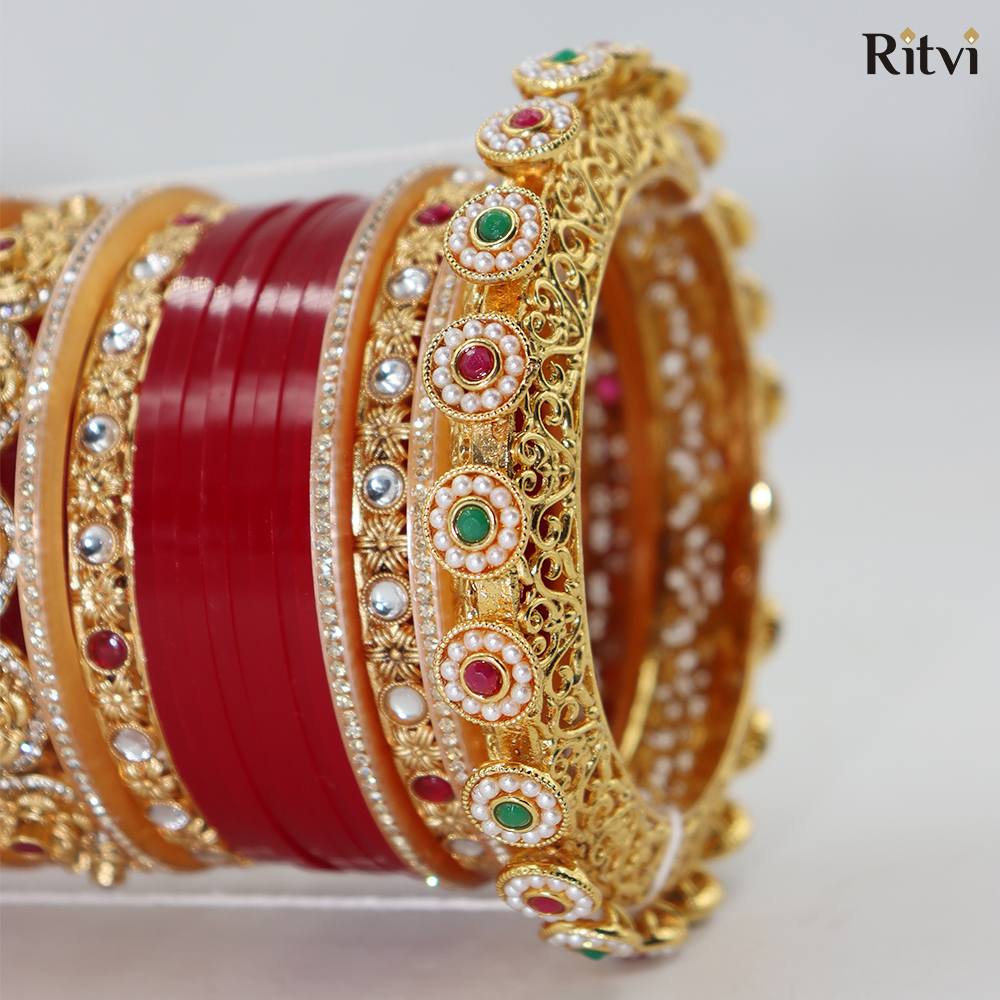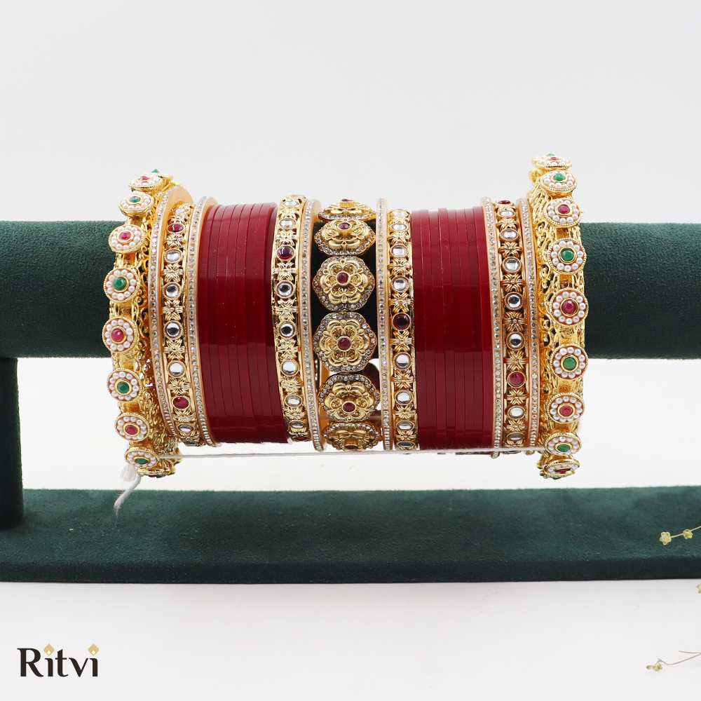 Beautify your hands with our Bridal Chura, designed with the most care and perfection to radiate royalty, elegance and tradition altogether. Each of our bangle is manually rounded and shaped from inside to provide utmost comfort to give you a rich velvety feel. Ritvi Jewels serves to always provide quality products.