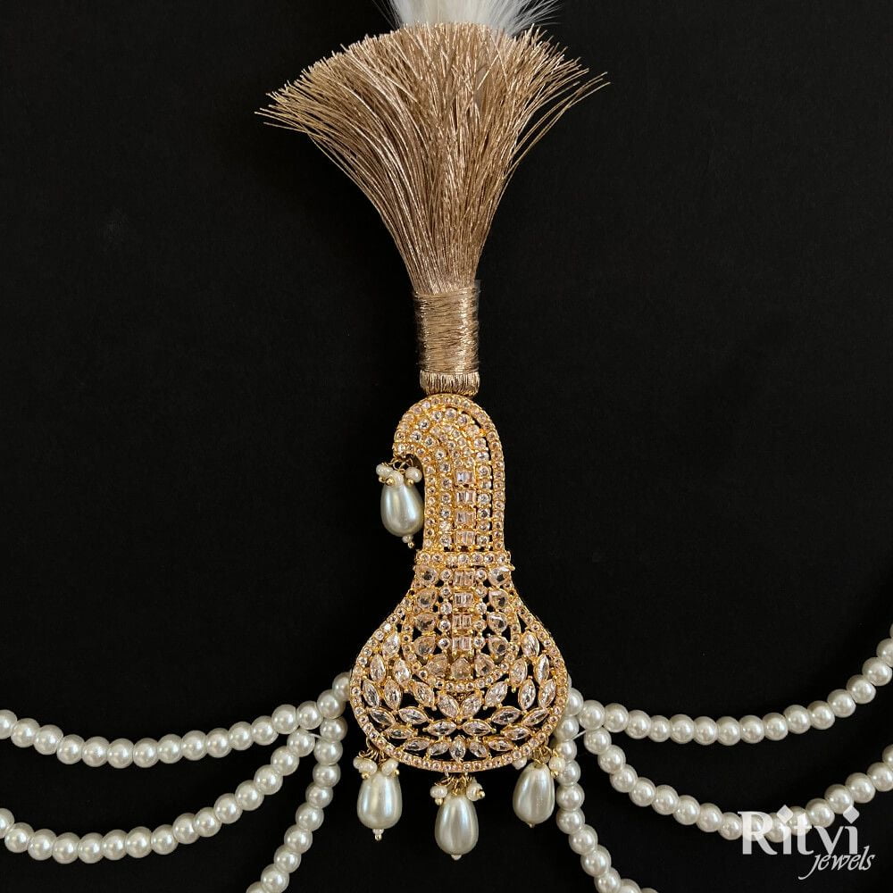 Kalgi is a traditional Indian ornament worn by grooms, as part of their wedding attire. It’s one of the many elements that contribute to the rich and diverse cultural tapestry of Indian weddings. The Kalgi holds cultural and traditional significance, symbolizing the groom’s special and important role during the wedding ceremony. Our Harshit Gold Finished Pearl AD Kalgi is studded with precious stones and pearls making it an eye-catching accessory.