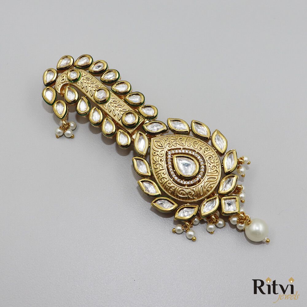 Be the first to review “Ritvi Rahil Gold Finished Pearl Kundan Kalgi” Cancel reply