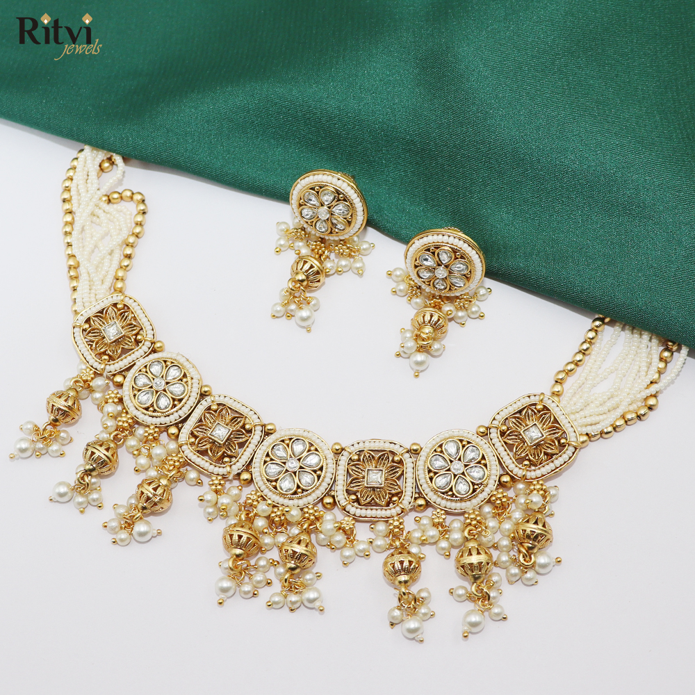 Rajwada Gold Choker are becoming highly wanted in the modern world because of the look they carry, the craftsmanship and the colour stones they use to embellish. And what better way than to have your favourite vintage necklaces at your doorstep just one click away? Shop our Priyanshi Rajwada Gold Choker Set with white pearls and beads, and imitation stone detailing with high gold plating.