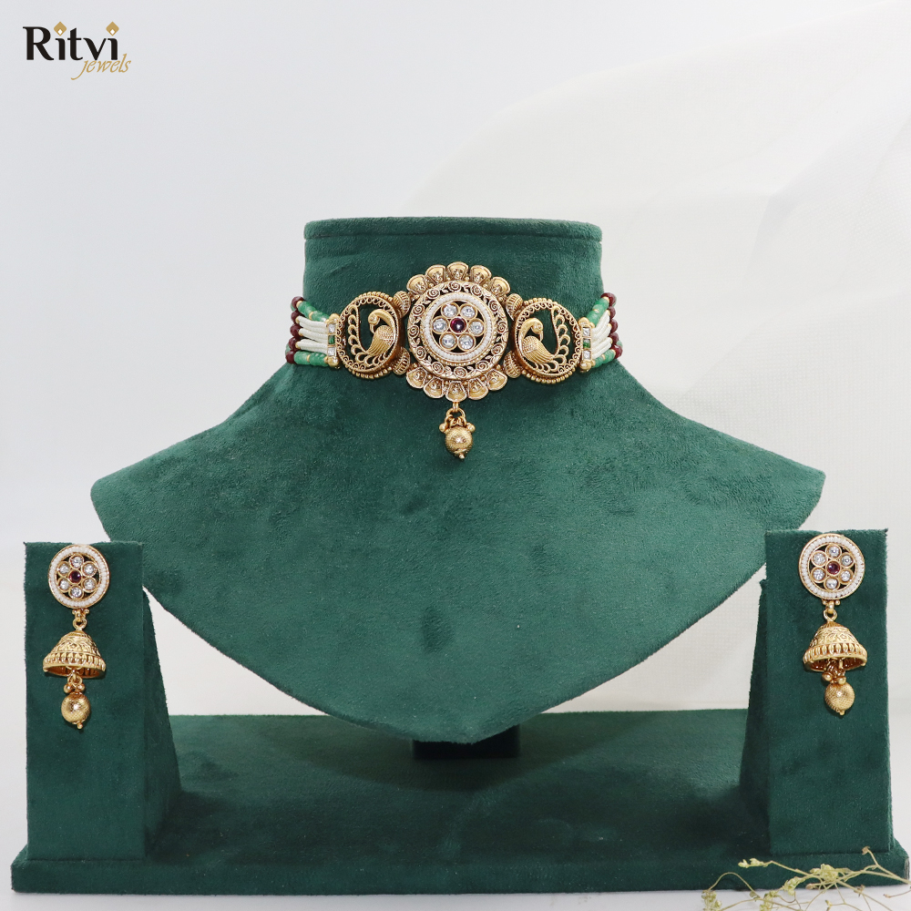 This Sanjana Choker Set by Ritvi Jewels exudes graceful tradition with a hint of vintage charm. At the heart of this set lies a grand circular medallion pendant, beautifully carved and embedded with Kundan stones and ruby-colored accents, flanked by delicately crafted peacock motifs on each side — a symbol of beauty and elegance.