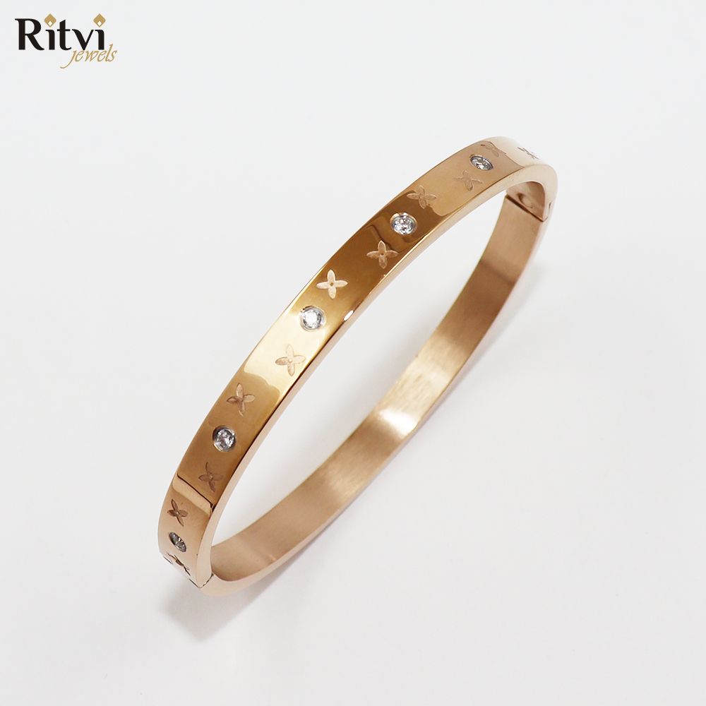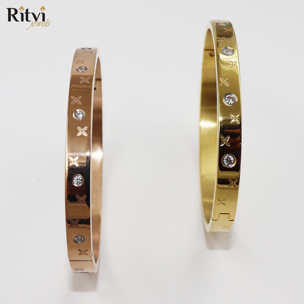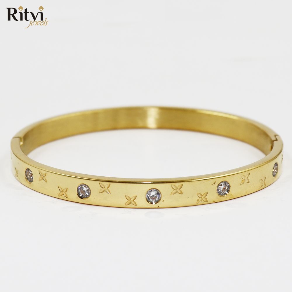 Our Shaya Band Bracelet For Women is a popular accessory for special occasions and cultural events among women. It is typically a solid, circular band with intricate designs or engravings plated in Gold for the rich royal feeling. The bracelet has a comfortable fit and is easy to wear, with a sturdy clasp to keep it secure on the wrist, with an openable lock.