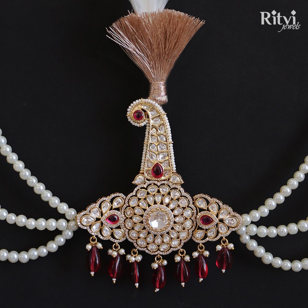 Kalgi is a traditional Indian ornament worn by grooms, as part of their wedding attire. It’s one of the many elements that contribute to the rich and diverse cultural tapestry of Indian weddings. The Kalgi holds cultural and traditional significance, symbolizing the groom’s special and important role during the wedding ceremony. Our Shrey Gold Finished Pearl Kundan Kalgi is studded with precious stones and pearls making it an eye-catching accessory.
