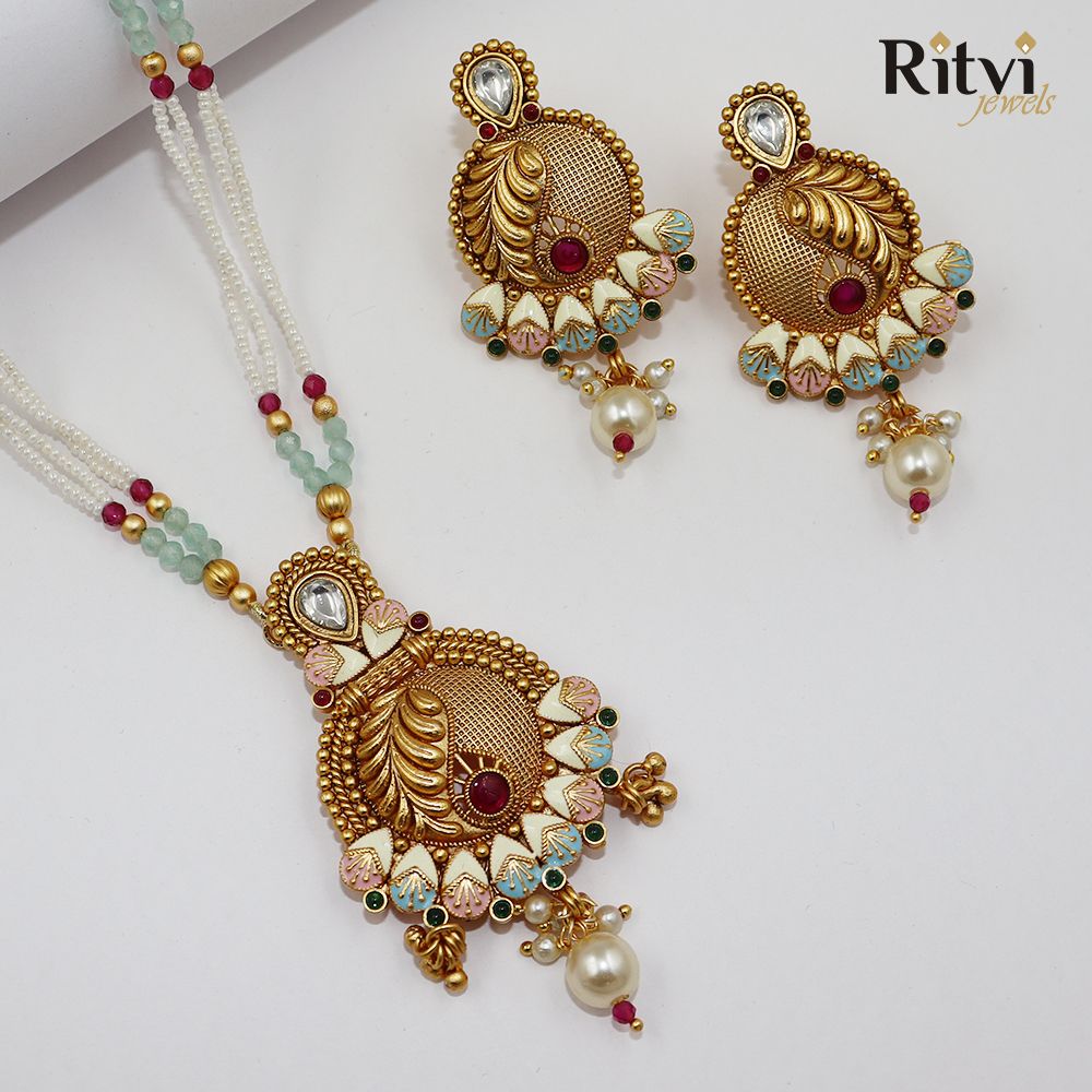 Rajwada Gold Pendant Set are becoming highly wanted in the modern world because of the look they carry, the craftsmanship and the colour stones they use to embellish. And what better way than to have your favourite vintage necklaces at your doorstep just one click away? Shop our Ritvi Shristhi Mint Meena Gold Polish Pendant Set with imitation stone detailing with high gold plating. Embrace the allure of tradition with a modern twist.