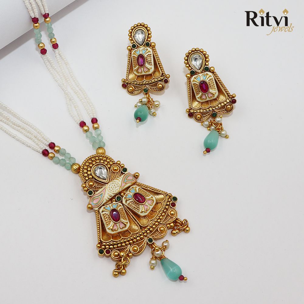 Rajwada Gold Pendant Set are becoming highly wanted in the modern world because of the look they carry, the craftsmanship and the colour stones they use to embellish. And what better way than to have your favourite vintage necklaces at your doorstep just one click away? Shop our Ritvi Yukti Mint Meena Gold Polish Pendant Set with imitation stone detailing with high gold plating. Embrace the allure of tradition with a modern twist.