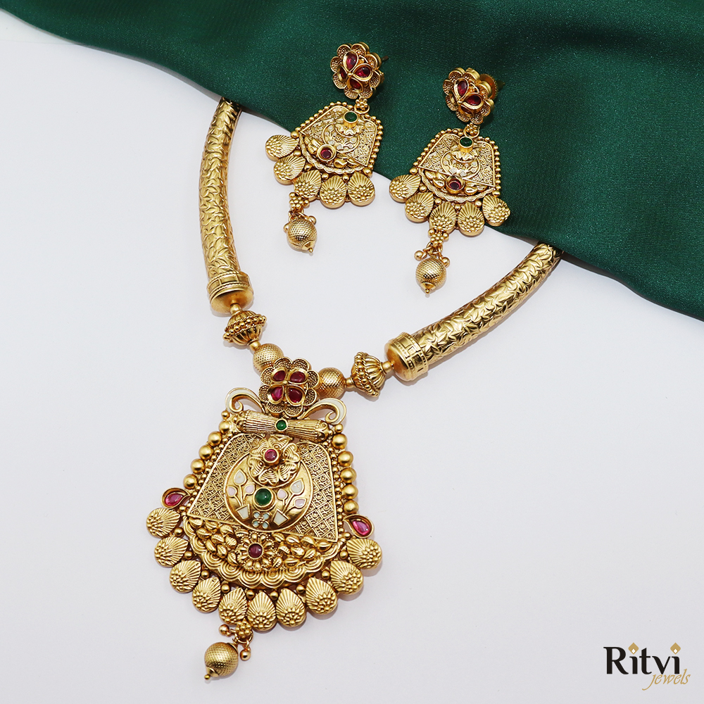 Antique necklaces are becoming highly wanted in the modern world because of the look they carry, the craftsmanship and the color stones they use to embellish. And what better way than to have your favourite vintage necklaces at your doorstep by just one click away. Shop our Shriya antique gold necklace set with white cage and imitation stone detailing.