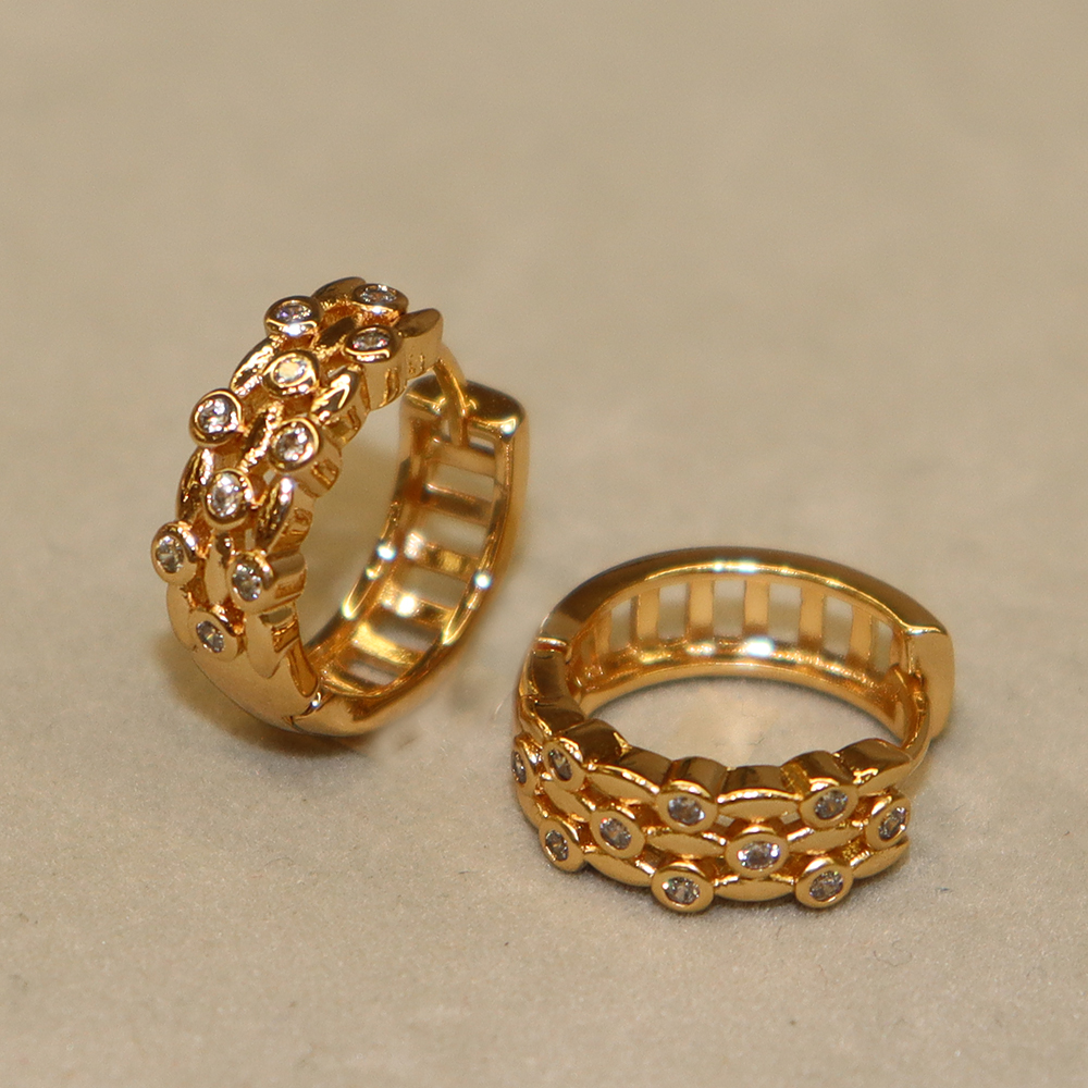 Ritvi Jewels’ Siya Earrings are beautifully crafted in radiant rose gold, featuring a unique honeycomb-style design adorned with dazzling round-cut stones. These earrings exude contemporary sophistication while maintaining a timeless appeal, making them perfect for daily elegance or dressing up for special events. A refined accessory for any jewelry collection.