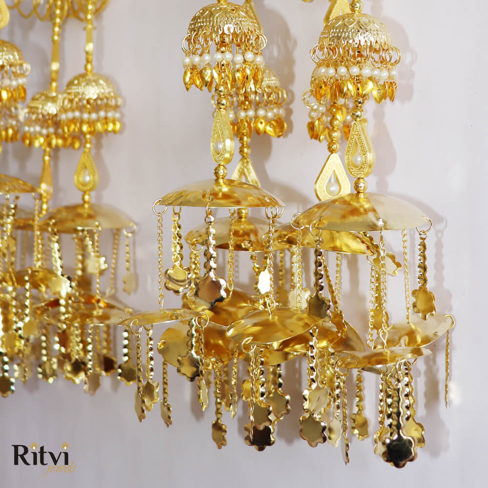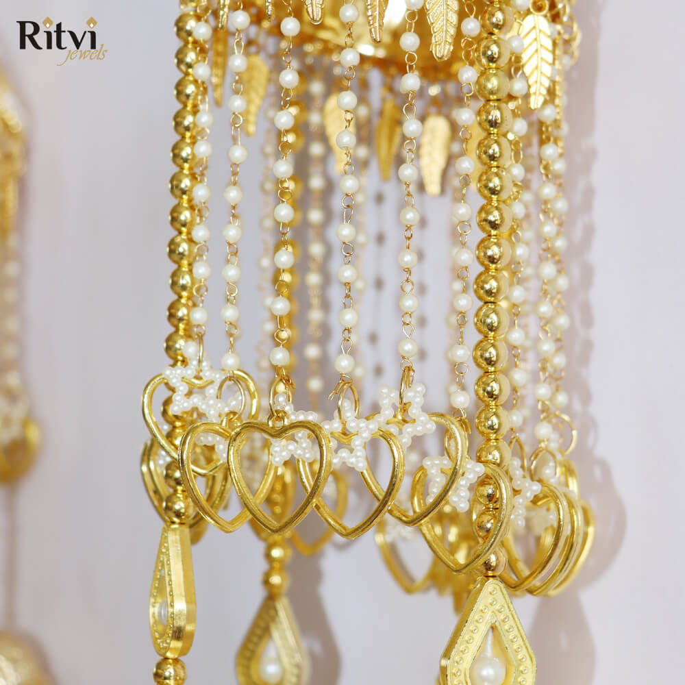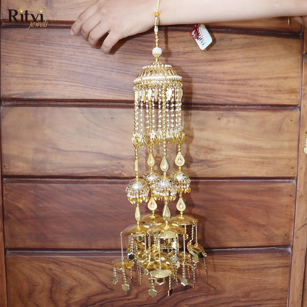 These traditional hanging ornaments also called Kaleera are worn by brides in India and are usually crafted as umbrella-shaped structures with intricate details, including beads, tassels, pearls, shells, butterflies, hearts and sometimes even ghungroos (small bells). The intricate designs, materials, and rituals of Kalira reflect the region’s cultural heritage. It’s believed that if a piece of the Kalira falls on someone, they’ll be the next to get married. This tradition adds an element of excitement and anticipation to the wedding celebrations. Bridal Kaleera are not just accessories but are deeply rooted in tradition and cultural symbolism, representing prosperity, happiness, and the bond of marriage. They encapsulate the blessings, hopes, and well-wishes for the bride’s journey into married life.